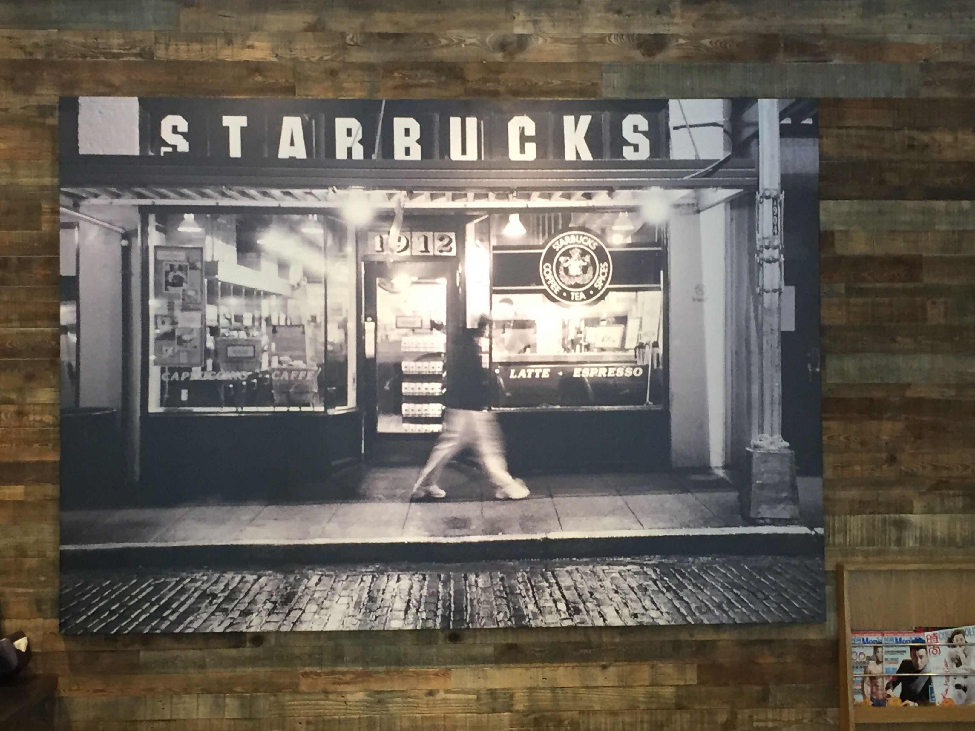 Walked into a Starbucks in Beijing China! This is the first thing I saw. Home! A photo of the first Starbucks in Seattle.