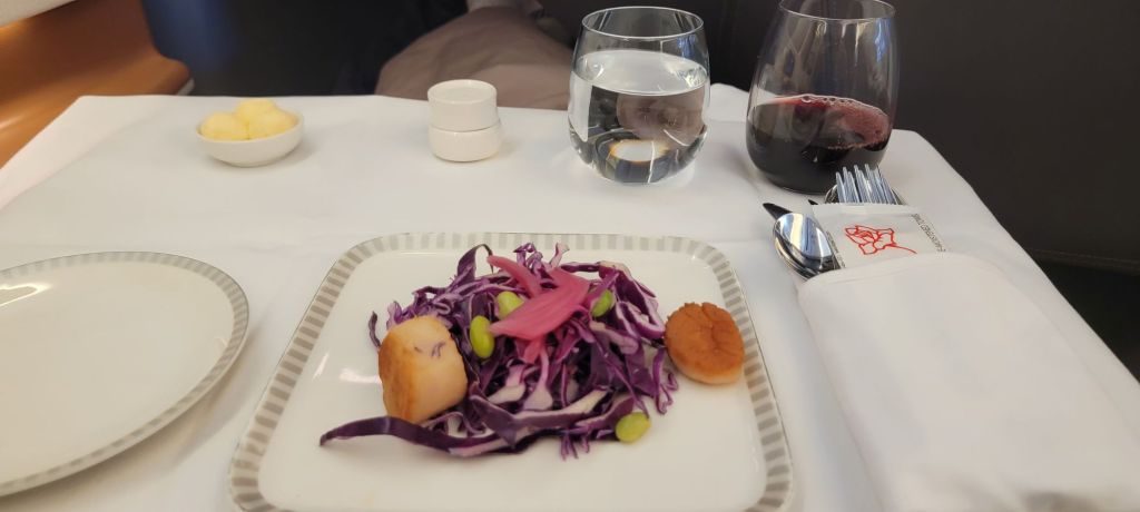 About an hour after takeoff the meal servie started with Seared Scallops with Red Cabbage and Edamame Salad, Pea Puree and Pickled Red Onions. Yummy Yummy to my Tummy….