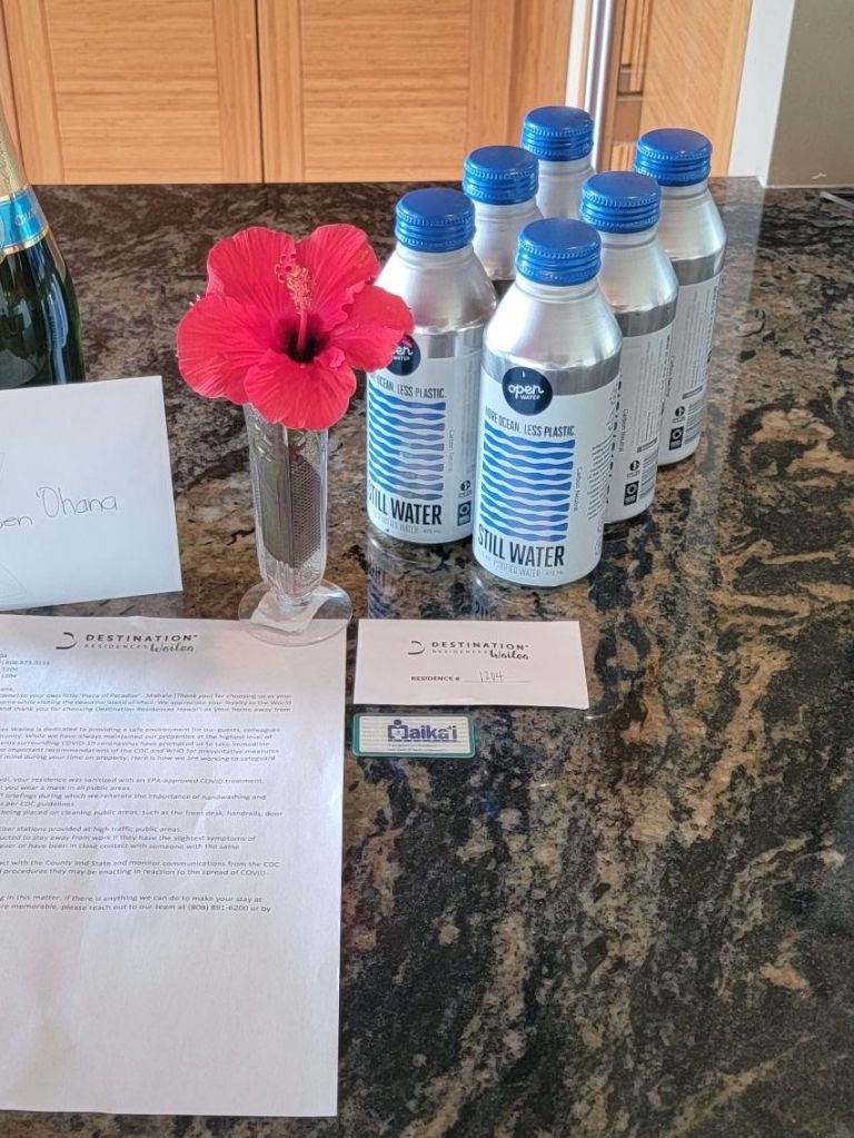 We used some Hyatt Points for our beautiful condo. We were welcomed with a bottle of Champagne and mutliple bottles (cans) of water, along with an Orchid.